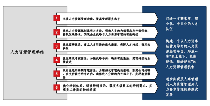 打造一支高素質(zhì)、職業(yè)化、專業(yè)化的人才隊伍,構(gòu)建一個以人力資本經(jīng)營為導(dǎo)向的人力資源經(jīng)營平臺,形成一套“能上能下、能高能低、能進能出”的人力資本管理機制,逐步實現(xiàn)從人事管理到人力資源管理到人力資本管理的跨越式發(fā)展。